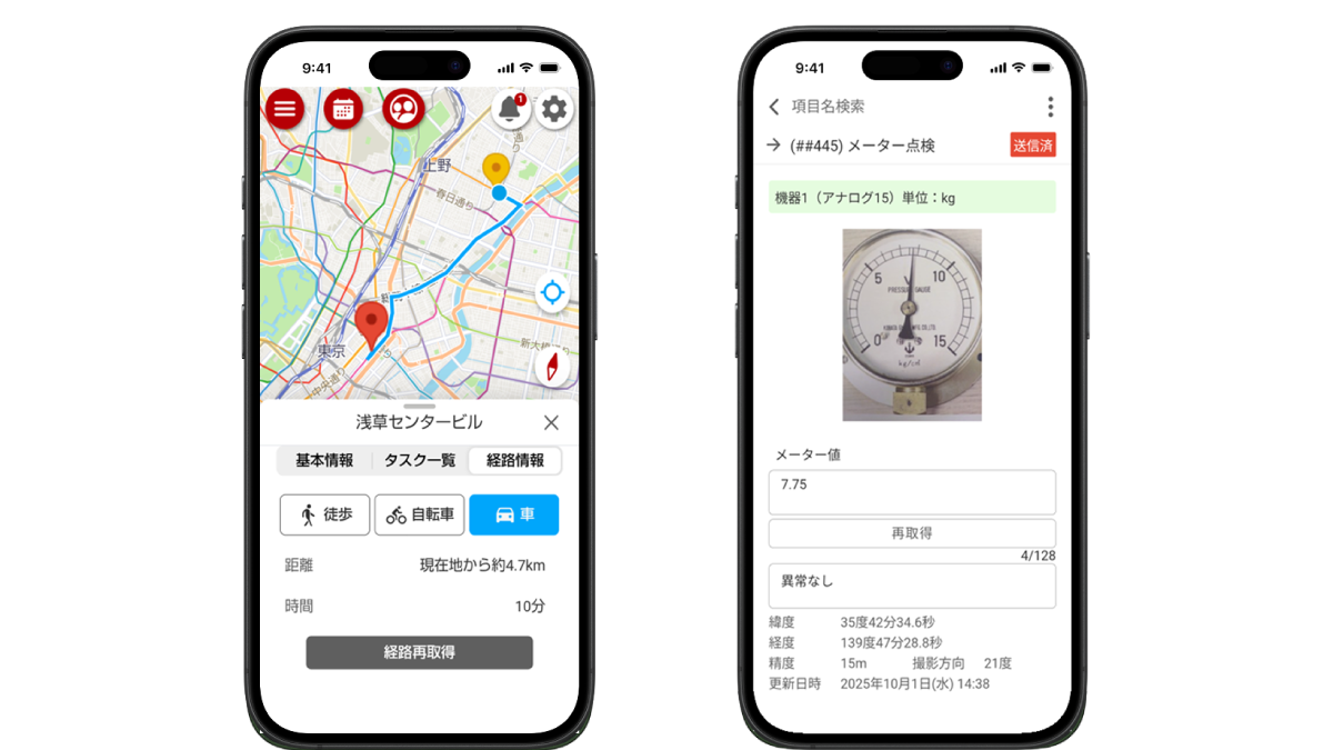 地図と連携する専用アプリで作業場所を確認、データや写真を入力するだけで簡単に報告書が完成します。電波が届かない場所でも使用でき、GPSや各種センサーを活用した正確な報告が可能です。