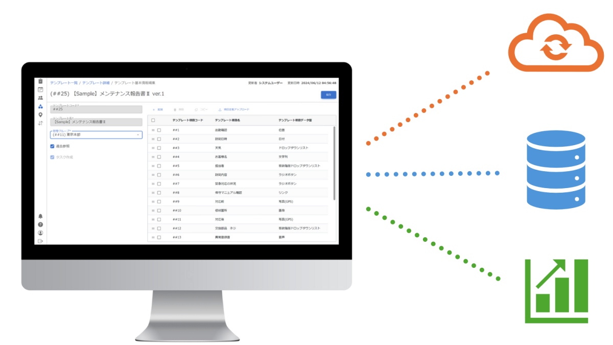 他のシステムとの連携が可能現場でのスマホ入力を容易にする為、様々な入力タイプ(ドロップダウン・ラジオボタン・写真・手書き文字など)を提供しており、業務に合わせた様々なフィールドタイプで設定可能です。標準提供のWeb-APIのご利用により、お客様の基幹システムや情報分析ソフト等とのシームレスな連携が可能です。