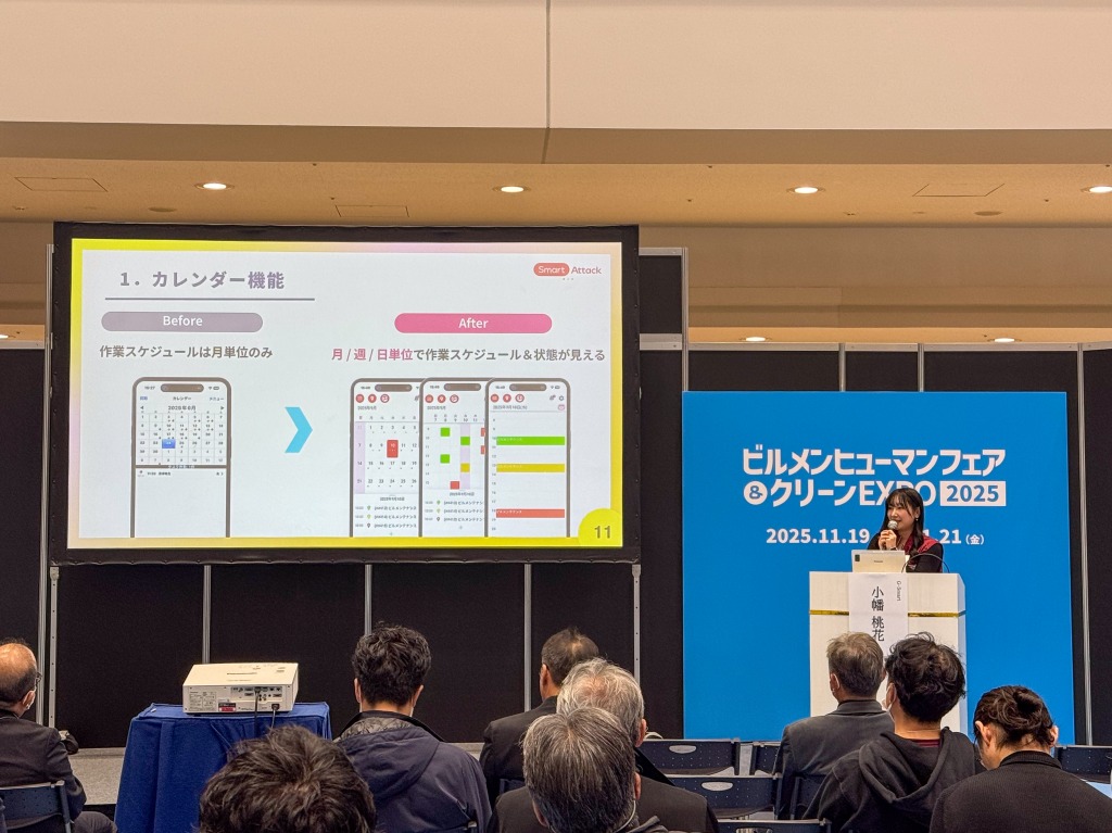 また2日目の出展者セミナーでは、ビルメンテナンス業の方々に向けて 、フルリニューアル版アプリ『Smart Attack V3』の初公開をテーマに講演を行い、