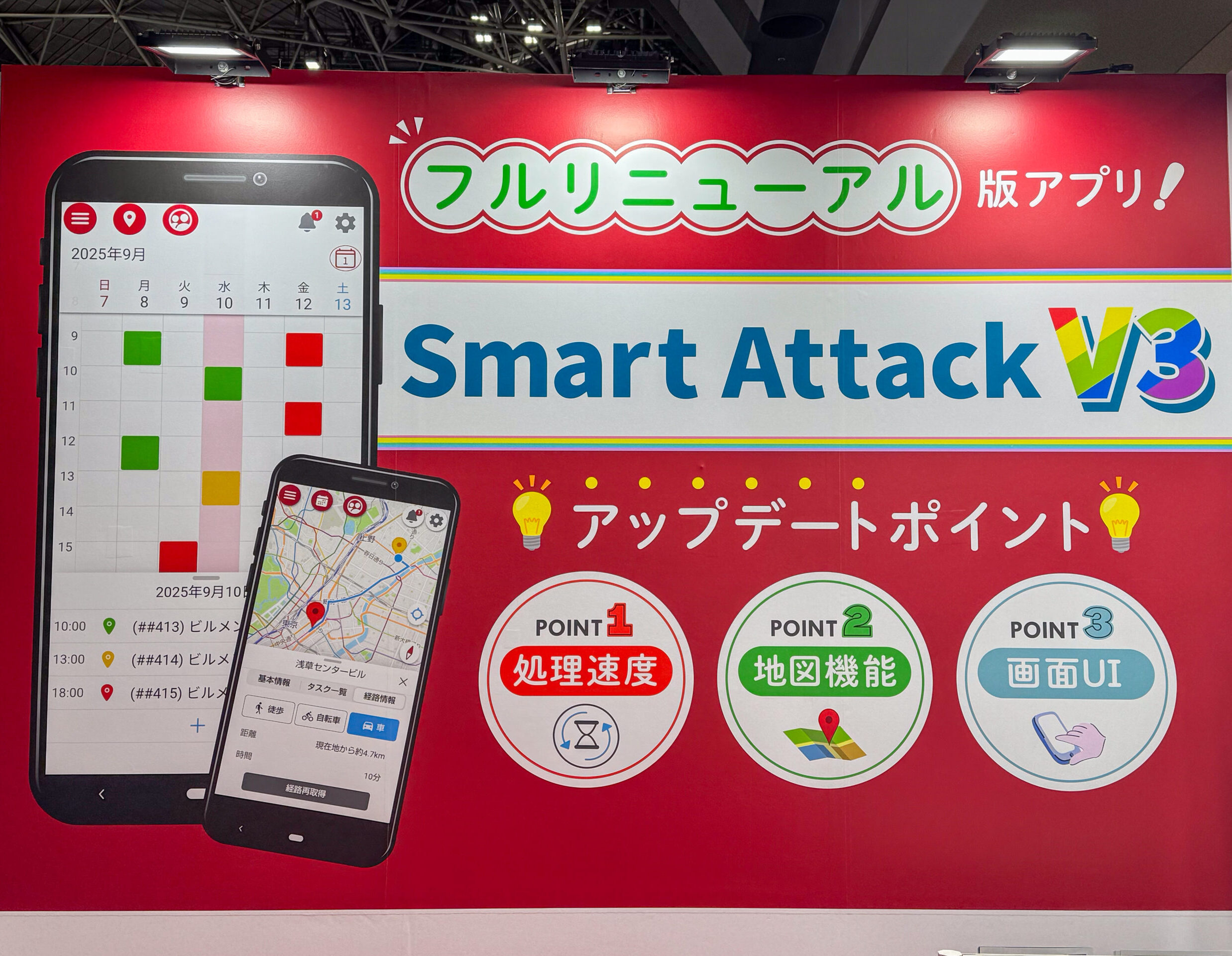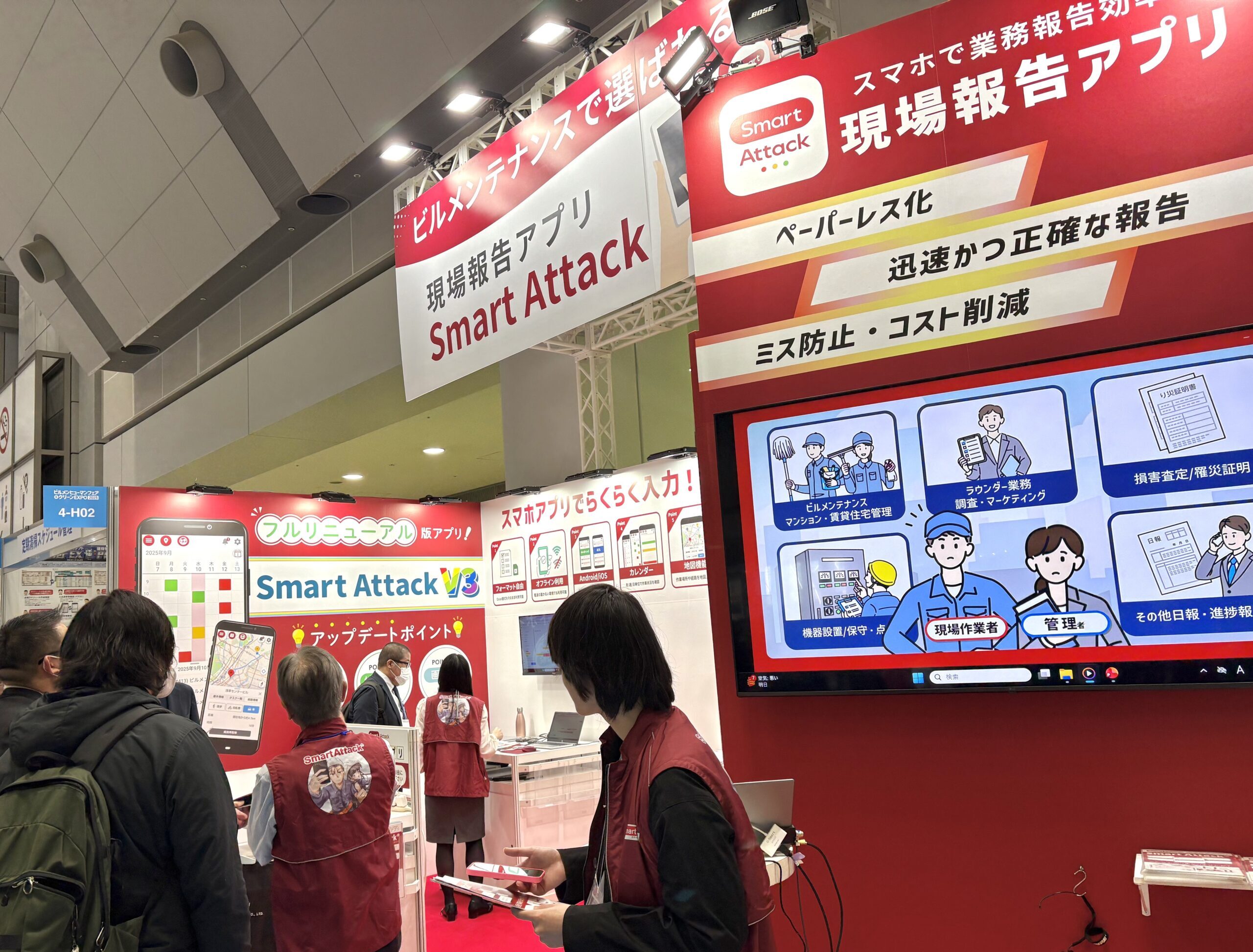 また2日目の出展者セミナーでは、ビルメンテナンス業の方々に向けて 、フルリニューアル版アプリ『Smart Attack V3』の初公開をテーマに講演を行い、