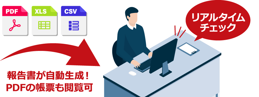 報告を入力後、サーバに送信すると報告書(Excel/PDF/CSV)が自動生成されるので、現場担当者は帰社の必要がなく効率的な業務を遂行できます。