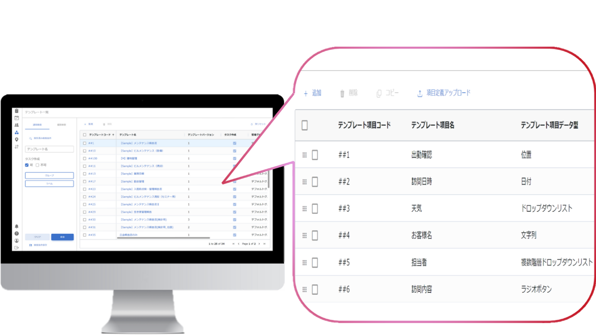 お客様のExcel報告書をスマホの専用アプリで簡単入力できるように、テンプレートとして最適化します。使用できる項目型は、日付・ドロップダウン・ラジオボタン・チェックボックス・写真・音声・外部連携・手書きなど19種類の入力形式に対応。様々なフィールド業務に応じたテンプレートを複数登録できます。